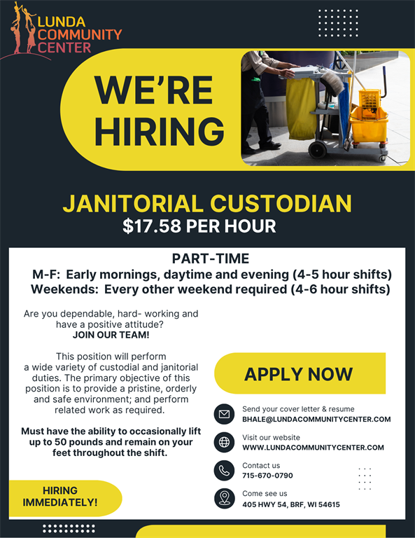 Do you want more than just a job? Are you looking to discover a sense of purpose and opportunities to contribute to the greater good, all while being in a fun environment? Then the Lunda Community Center is the place for you! Join us!